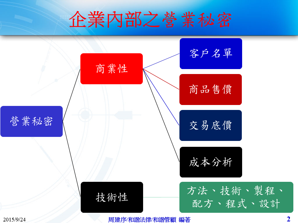 營業秘密分成商業性及技術性營業秘密二種,基本上需符合營業秘密法第二條的定義及三個要件方為營業秘密!現在客戶問商品底價及客戶資料究應如何操作才能被認定為營業秘密,得以具體受到保護? 希望本公司連同競業禁止一併提供一個整體管理機制包括規章.契約及人員訓練!