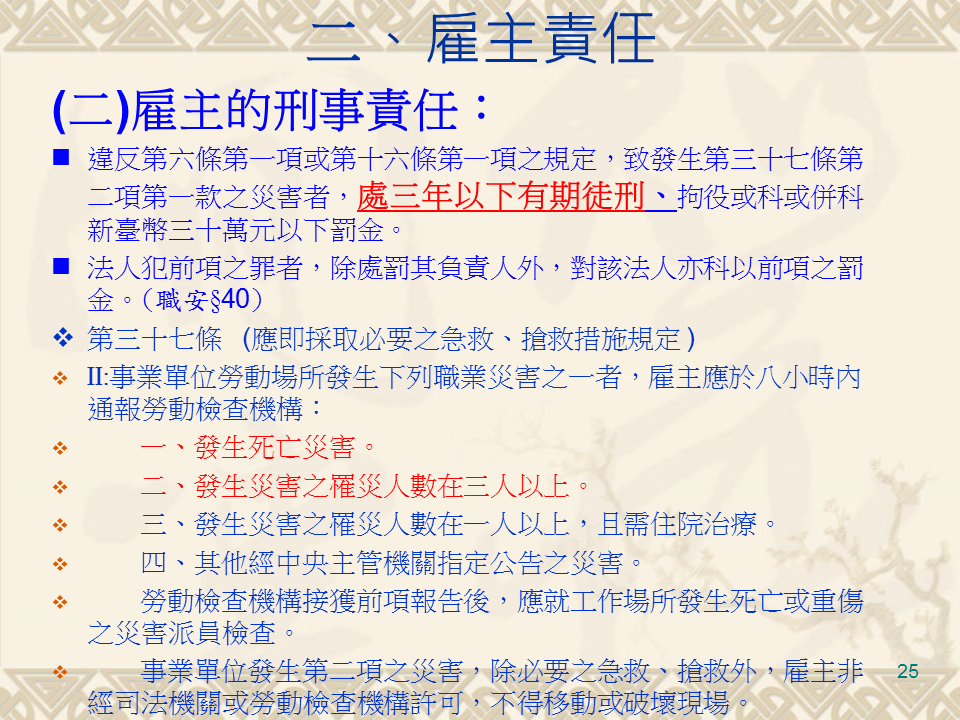 昨晚一雇主夫婦慌張的跑來諮詢職災的問題,就因為受災者死亡,雇主刑責會有三年以下有期徒刑! 整個會議開到晚間22:30 ! 詢問的重點包含民事賠償/勞基補償/勞保給付/職安法重要條文/雇主責任險/附加條款等議題,均為我單元課程的重點,平常一天的課程從1千~3,4千不等,此客戶雖已委任律師然,仍以鐘點諮詢的方式向我尋求協助,我收費是平日上課的10倍起跳! 會後客戶當然是非常滿意且還有後續要繼續諮詢的! 但是職災課程,平常企業仍然興趣缺缺!