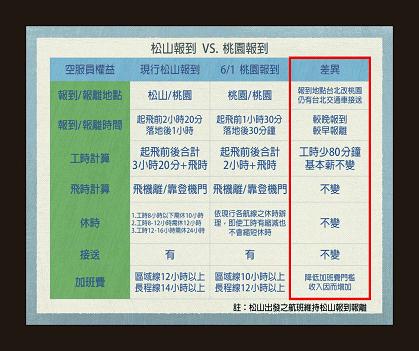報到地點改為桃園總公司, 才開始起算工作時間,飛機落地後改為提前半小時即結束工作時間, 所謂的報到報離! 台北到桃園車程50分鐘, 原飛機落地1小時才報離,本次改為飛機落地30分鐘就報離, 如此較晚計算工時起算點,且較早計算結束點,相差80分鐘, 其中休息時間若仍然維持一樣24小時不變,難道不是勞動條件變差嗎?公司稱優於民航局規定,但縱員工並不爭執工資加班費將減少,單純以休息時間將被壓縮產生過勞問題,主管機關難道能以約定書合法為由而坐視不管嗎? 難道84-1的工作者就應該被合法剝奪嗎? 特別以此聲援華航空服員機師及修護職業工會的朋友!
