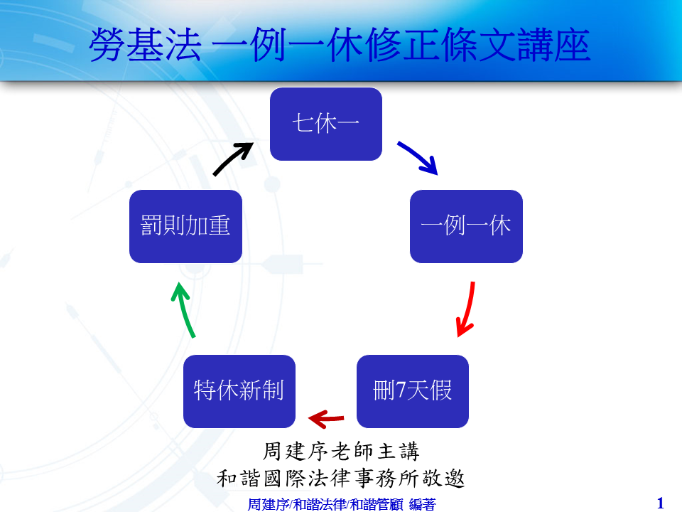 最近一例一休上路以來,負面效應不斷顯現,反對聲浪此起彼落, 但是我們終究發現談論批評反對者多對本制度一知半解,不願花時間理解新制度,為了特定立場或特定目的一謂的批評來博版面,將任何的抱怨或一切的不順利均歸罪於一例一休,很多的理由根本未論及制度本身的核心問題,邏輯上矛盾者更是比比皆是!