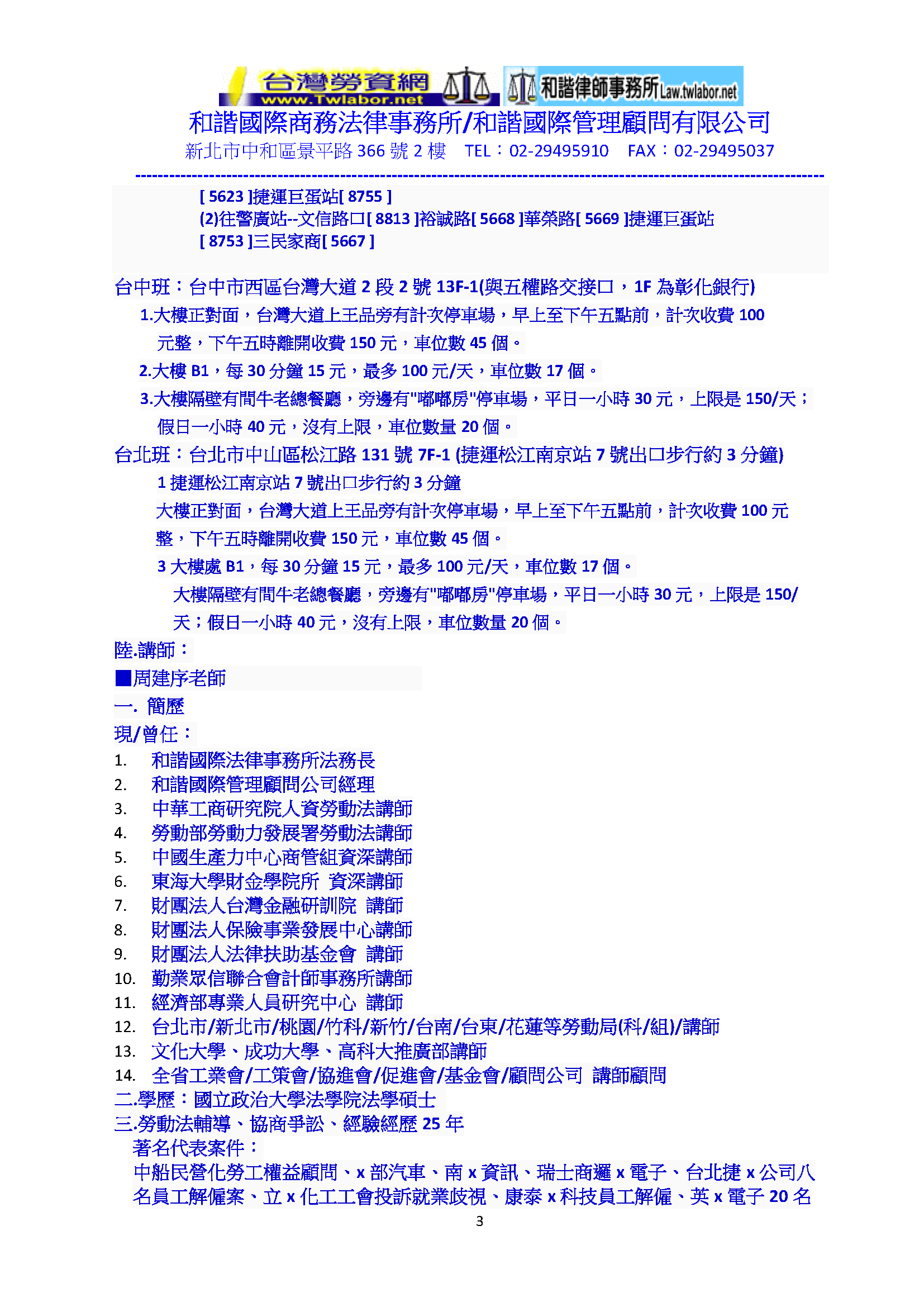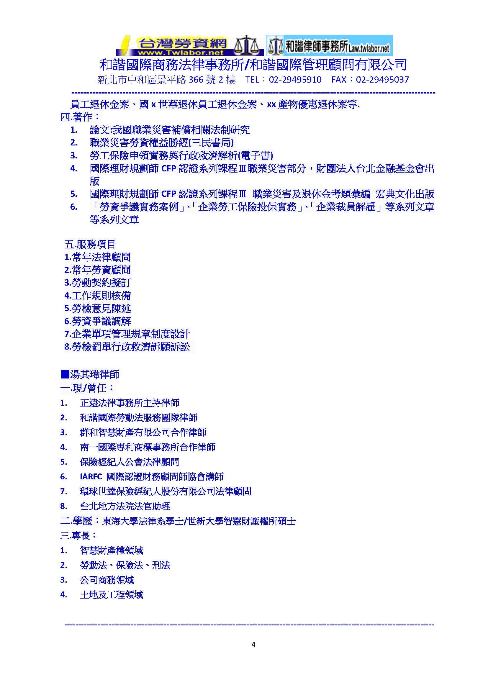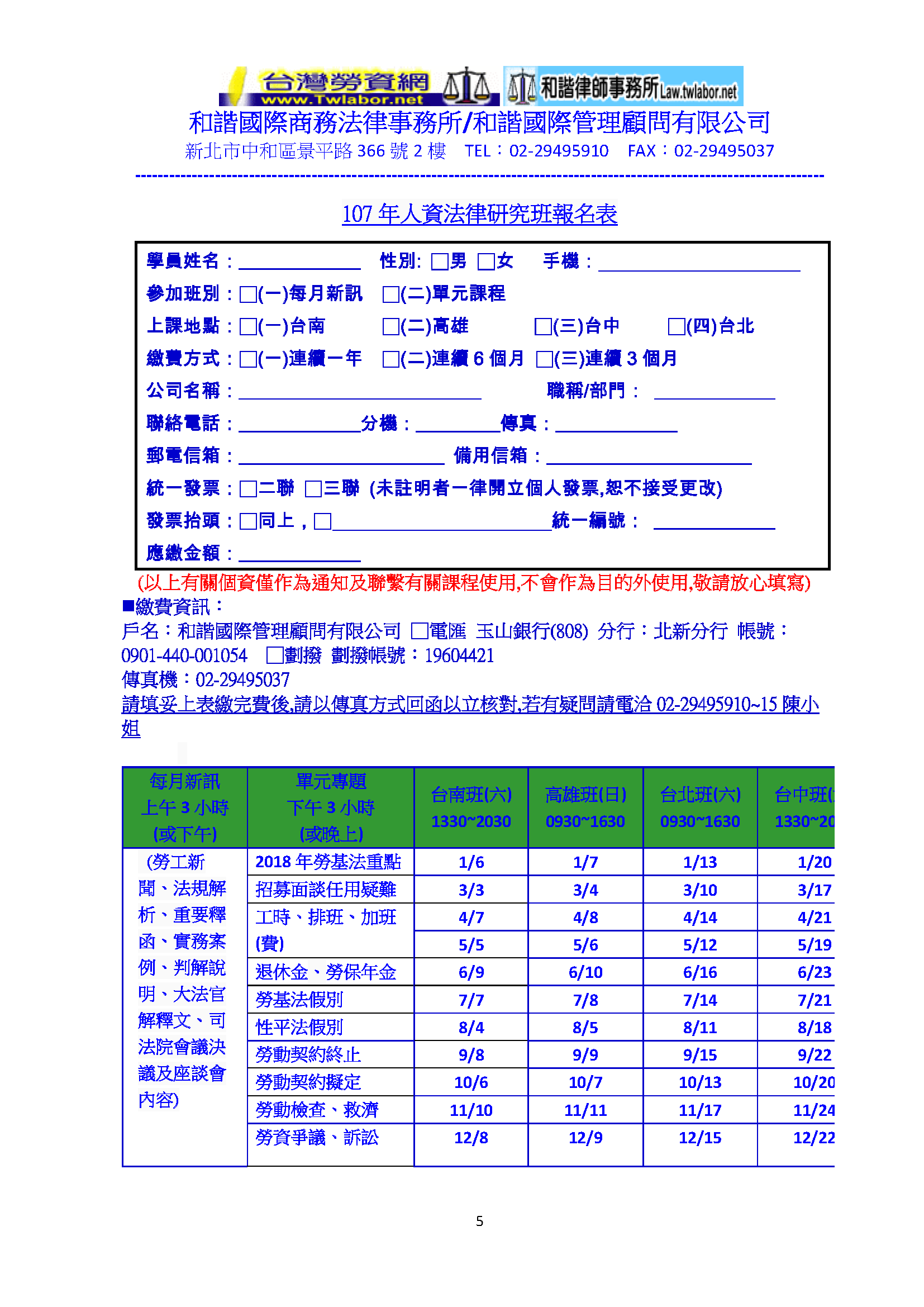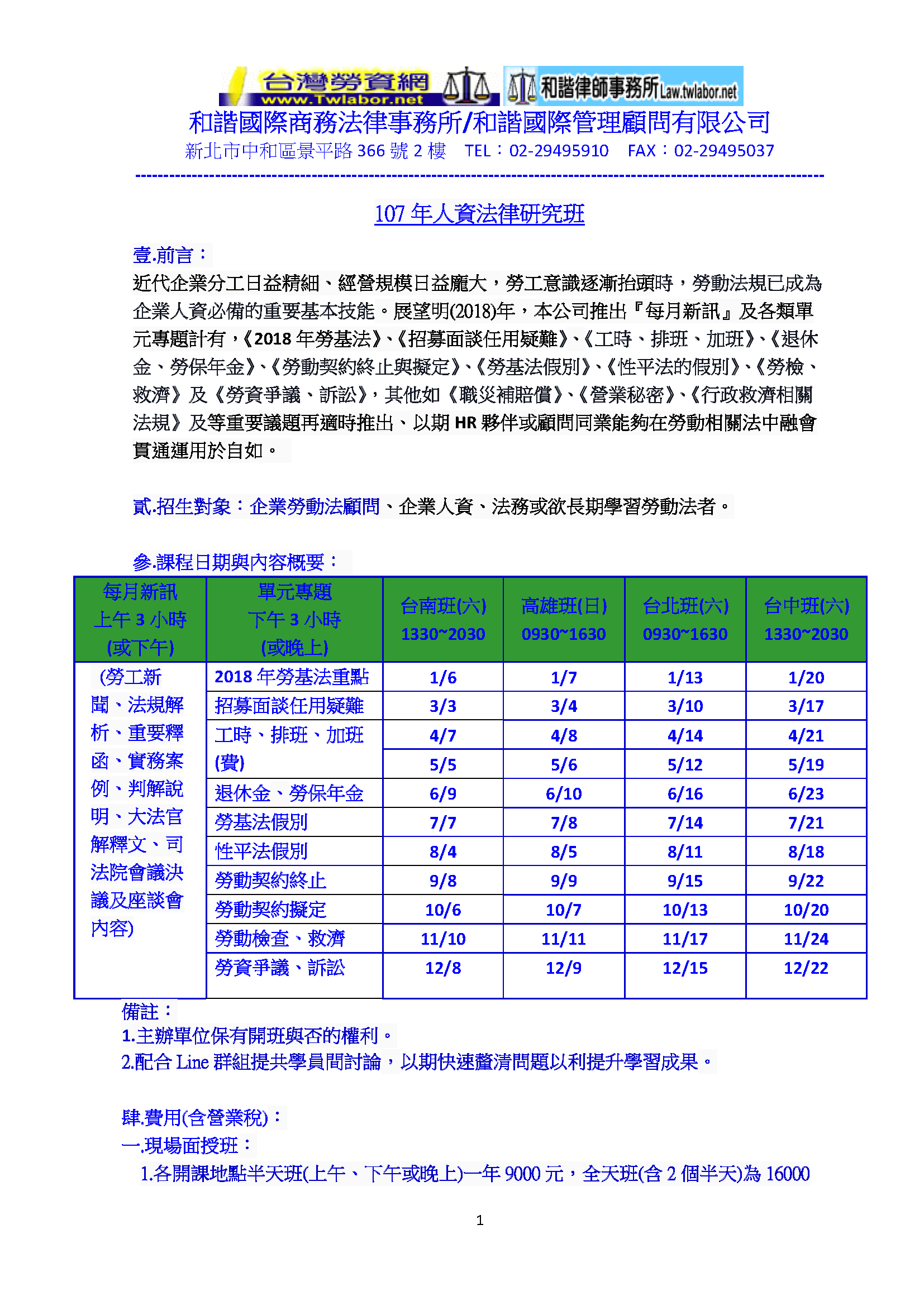 近代企業分工日益精細、經營規模日益龐大,勞工意識逐漸抬頭時,勞動法規已成為企業人資必備的重要基本技能。展望明(2018)年,本公司推出『每月新訊』及各類單元專題計有,《2018年勞基法》、《招募面談任用疑難》、《工時、排班、加班》、《退休金、勞保年金》、《勞動契約終止與擬定》、《勞基法假別》、《性平法的假別》、《勞檢、救濟》及《勞資爭議、訴訟》,其他如《職災補賠償》、《營業秘密》、《行政救濟相關法規》及等重要議題再適時推出、以期HR夥伴或顧問同業能夠在勞動相關法中融會貫通運用於自如。