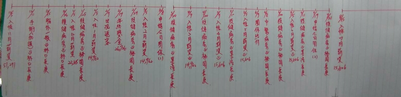 勞工去年年底在公司中風,下圖是公司給薪金額,第一個月是給全薪,之後給的是本薪的一半,約不到全薪的1/4! 具勞工方面的人說,資方請他們與勞保局聯絡,並自行申請勞保職災給付!