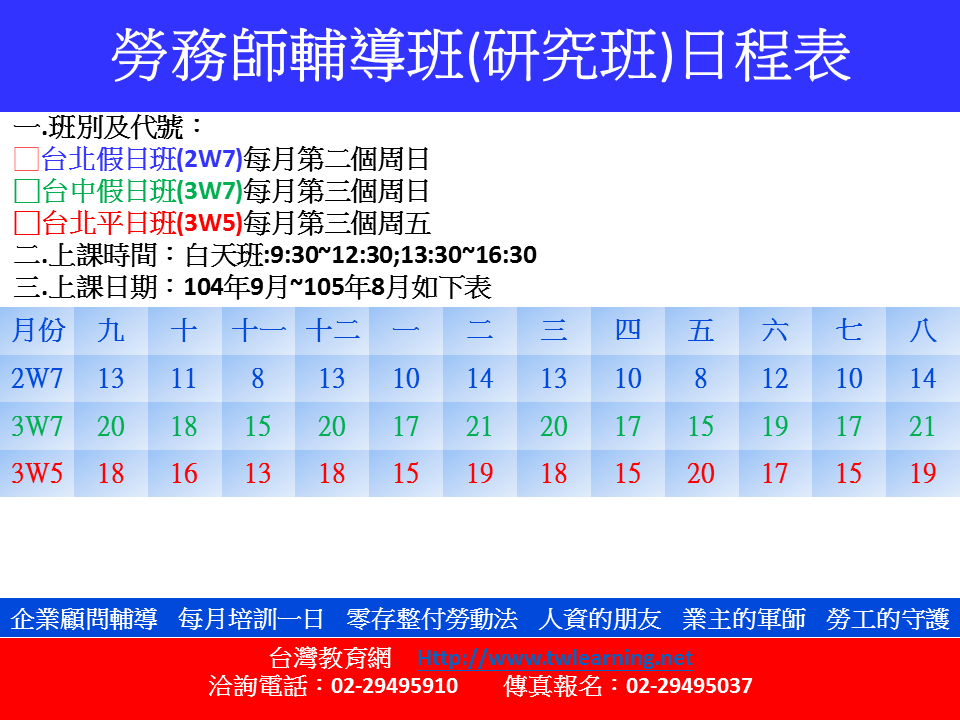 勞動基準法相關人口已逾1000萬人,服務的空間無限且不斷擴大中,未來20年最熱門的行業,勞務管理師!不論您來自任何種行業、何種職位,只要有心能夠堅持,接受完整訓練後都能成為頂尖的勞務管理師,不僅可當第二專長不怕失業,又可提升自己的專業能力,保險顧問亦可藉以擴大自己服務的領域以爭取高額保單。勞工法令的養成,需長期持續不斷的學習,才能夠有所成果。投資自己掌未來握,歡迎您的加入!